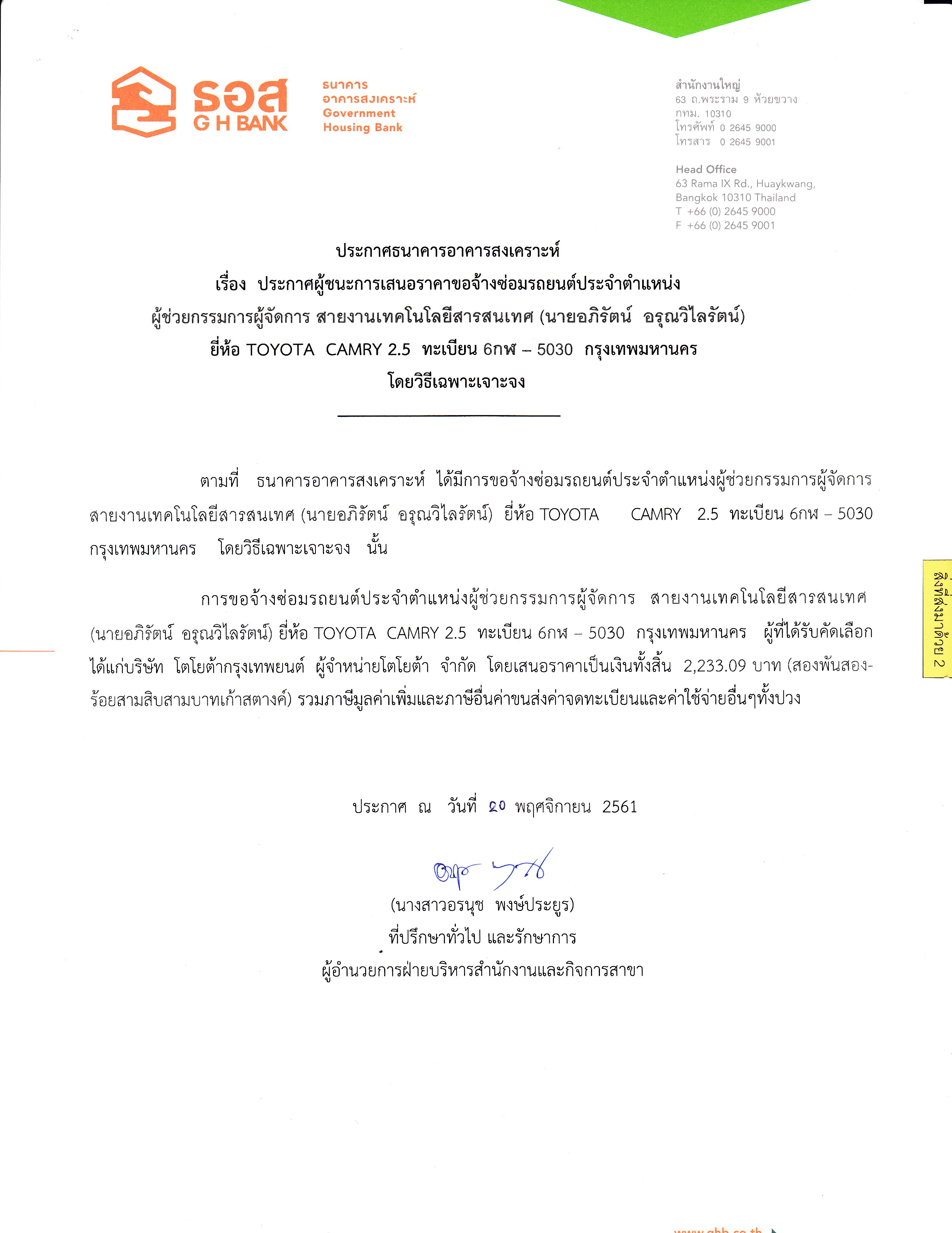 ธอส.ประกาศผู้ชนะการเสนอราคาซ่อมรถยนต์ประจำตำแหน่งผู้ช่วยกรรมการผู้จัดการ(คุณอภิรัตน์ อรุณวิไลรัตน์)