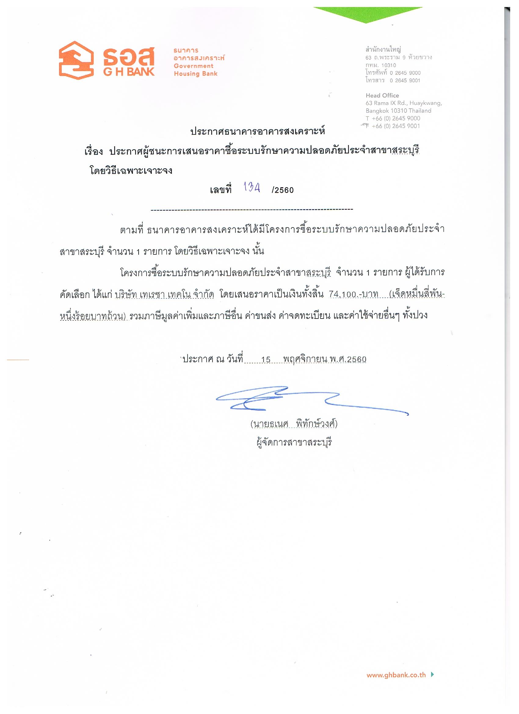 ประกาศผู้ชนะการเสนอราคาซื้อระบบรักษาความปลอดภัยประจำสาขาสระบุรี โดยวิธีเฉพาะเจาะจง
