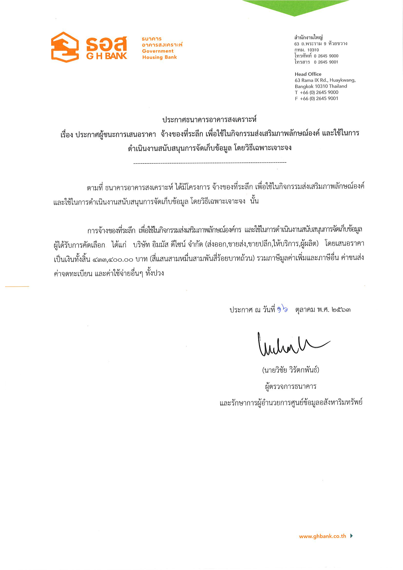 ประกาศธนาคารอาคารสงเคราะห์ เรื่อง ประกาศผู้ชนะการเสนอราคา จ้างผลิตหนังสือคู่มือรายการทรัพย์สำหรับงานมหกรรมการเงินกรุงเทพฯ ครั้งที่ 20 โดยวิธีพิเศษ