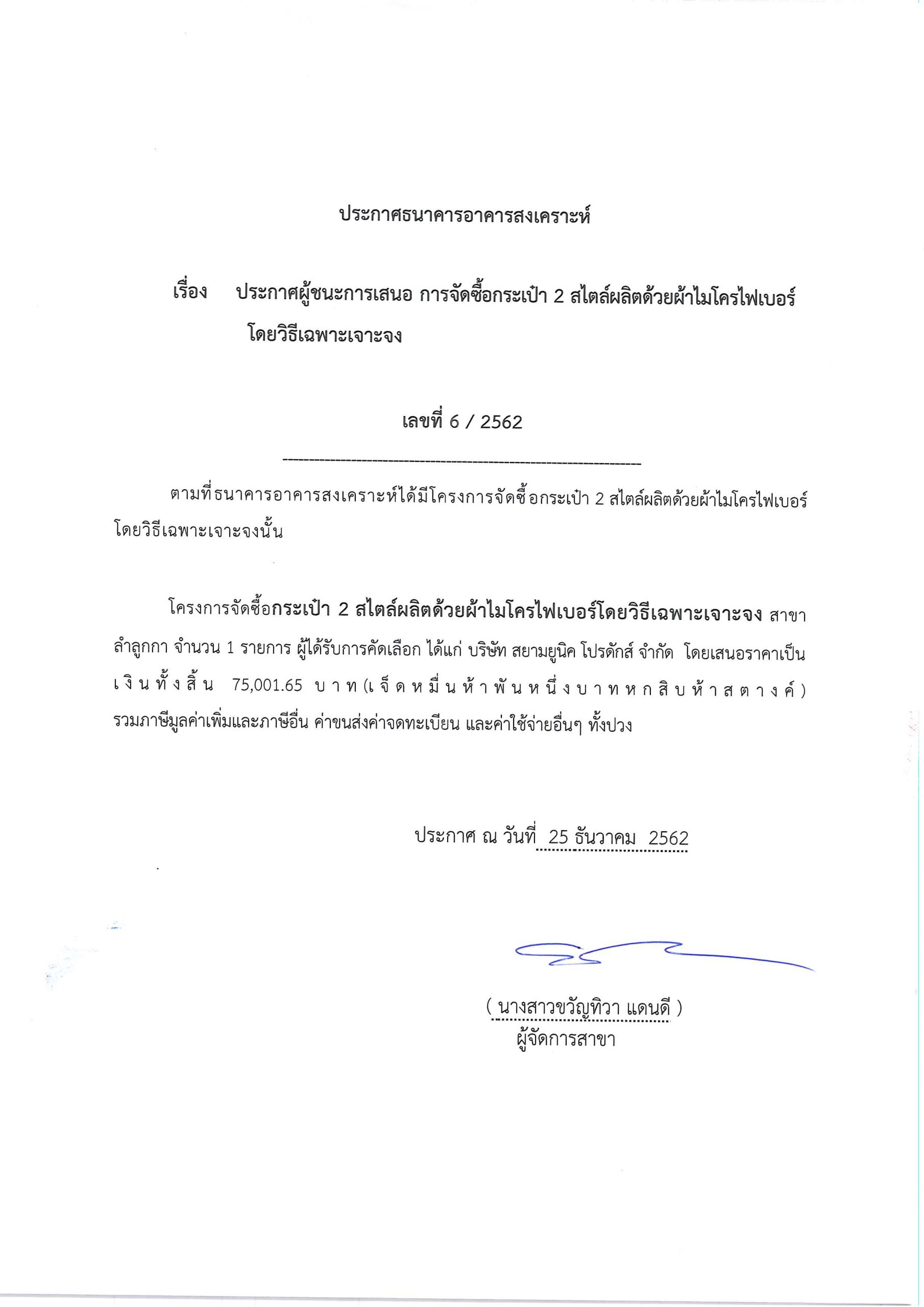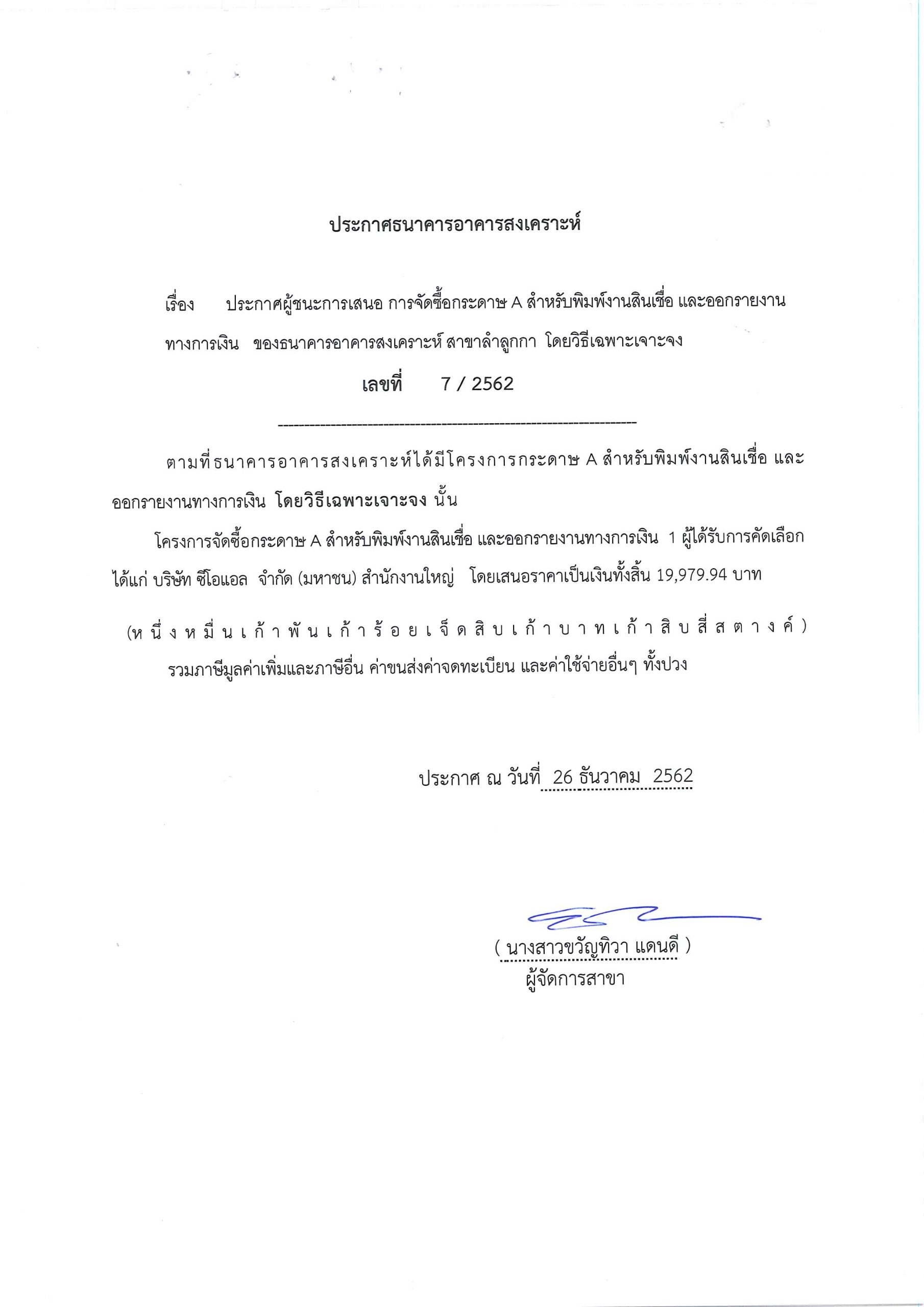 ประกาศผู้ชนะการเสนอ การจัดซื้อกระดาษ A สำหรับพิมพ์งานสินเชื่อ และออกรายงานทางเงิน ของธนาคารอาคารสงเคราะห์ สาขาลำลูกกา โดยวิธีเฉพาะเจาะจง