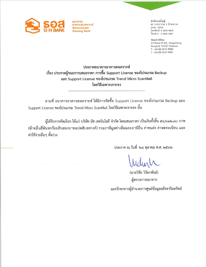 ประกาศธนาคารอาคารสงเคราะห์ เรื่อง ประกาศผู้ชนะการเสนอราคาจัดจ้างผู้เชี่ยวชาญด้านเทคโนโลยีสารสนเทศ ของสายงานตรวจสอบ โดยวิธีพิเศษ