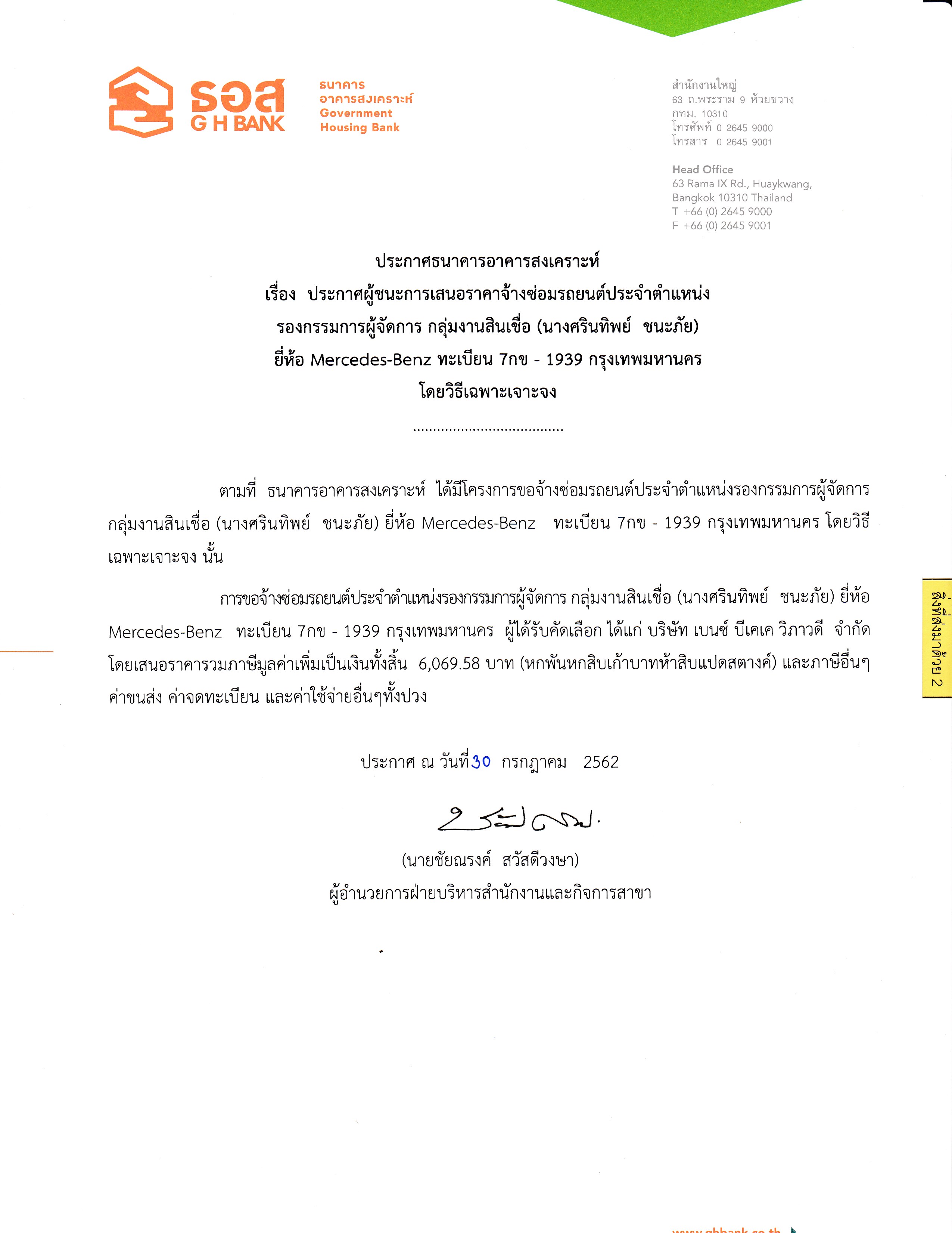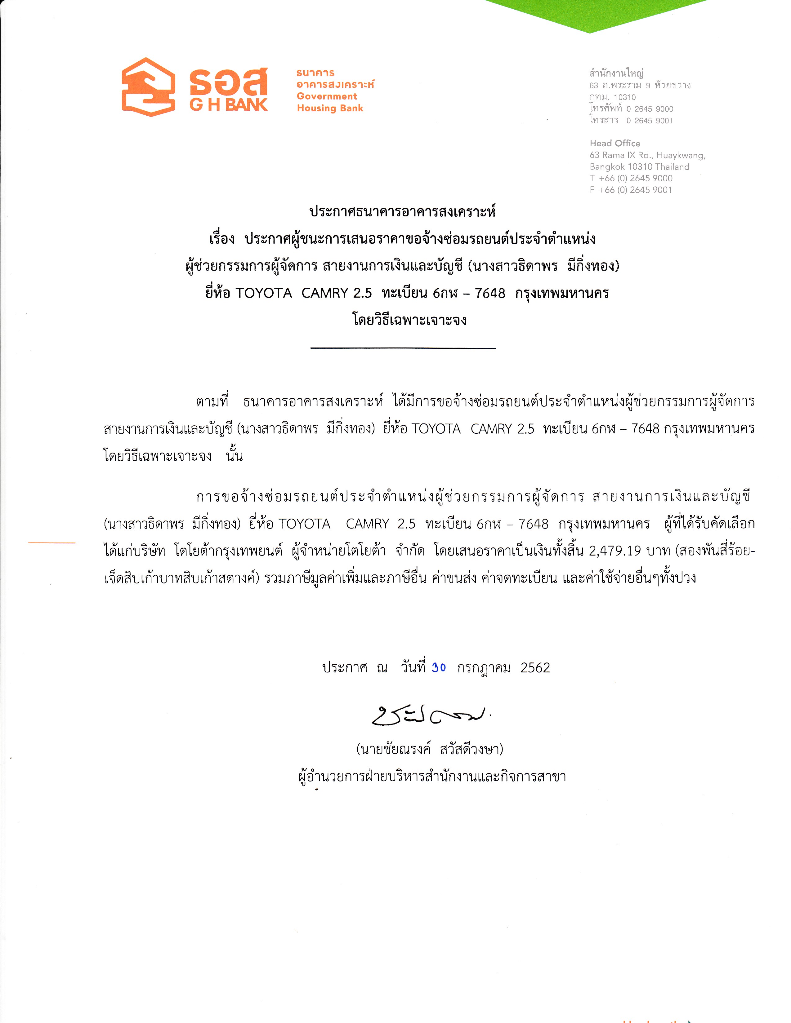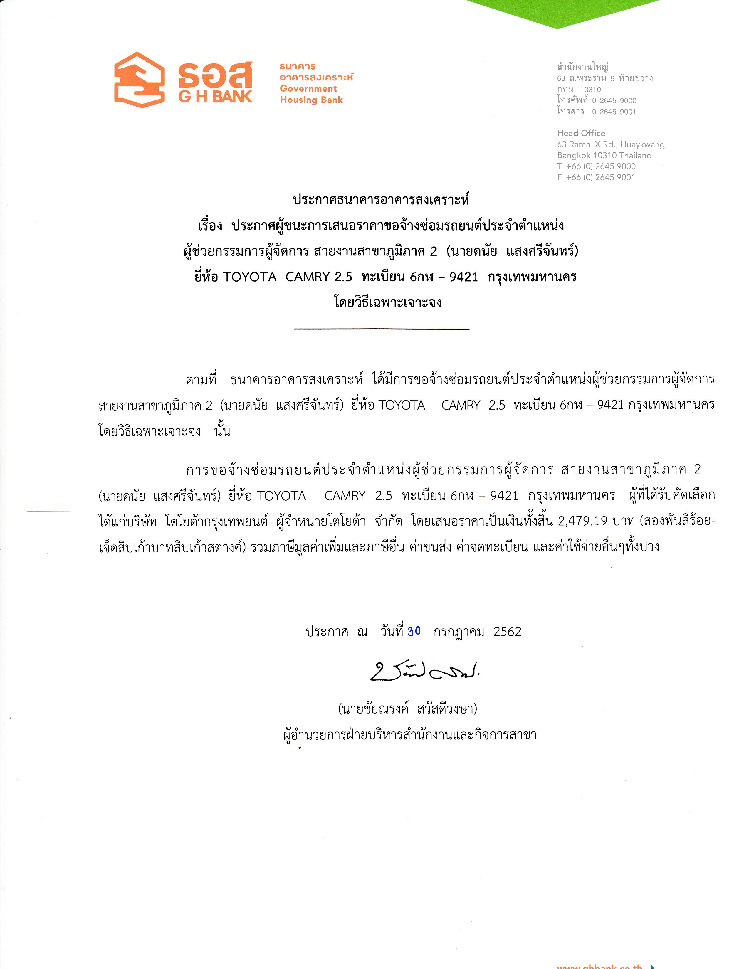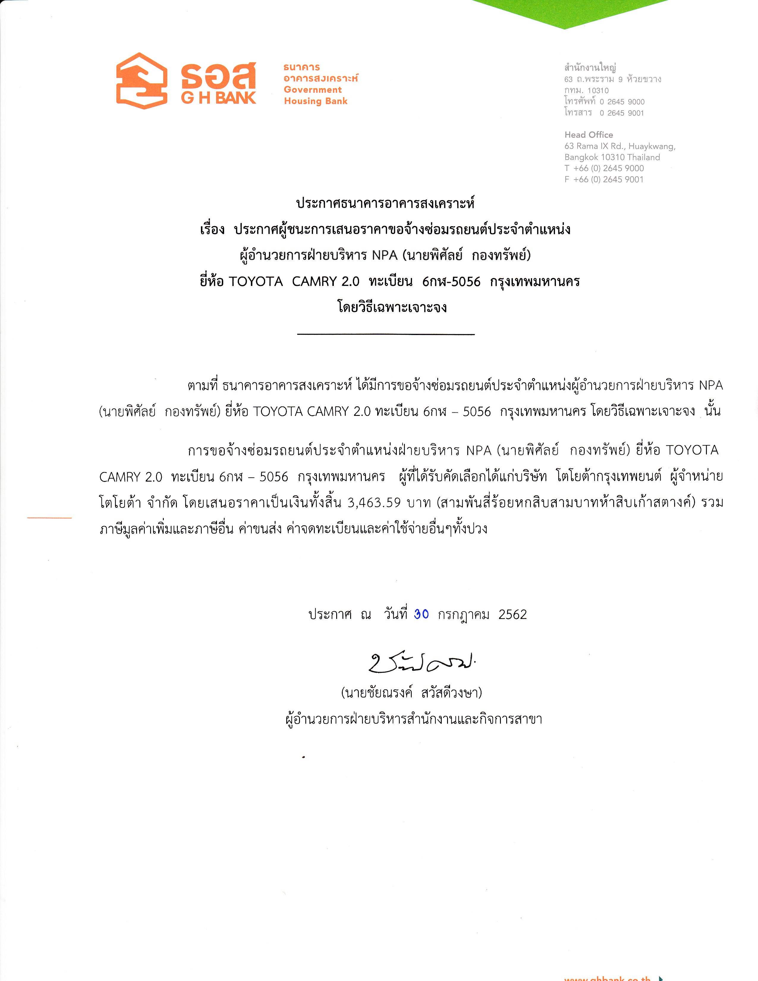 ประกาศผู้ชนะการเสนอราคาซ่อมรถยนต์ประจำตำแหน่ง (คุณพิศัลย์ กองทรัพย์)