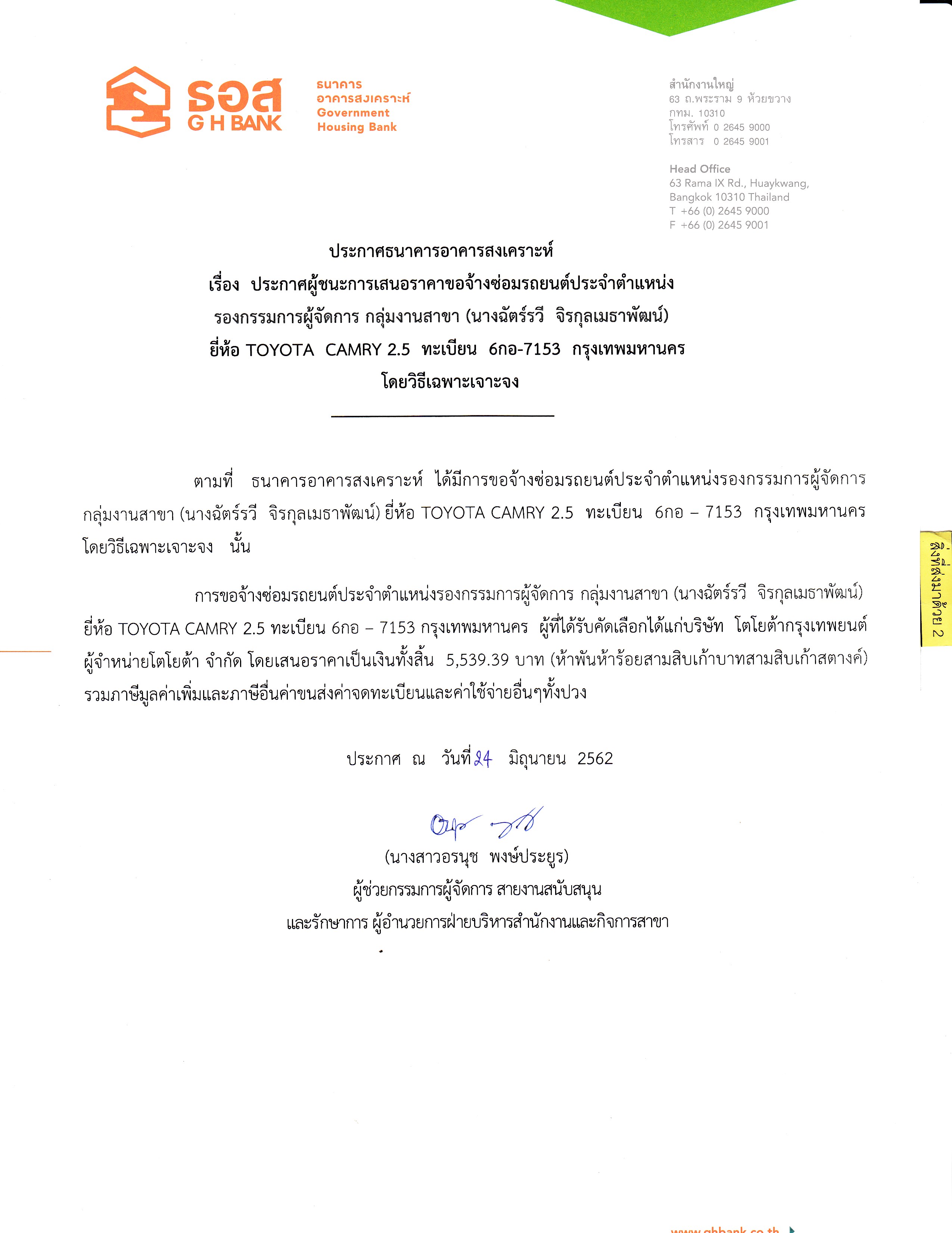 ประกาศผู้ชนะการเสนอราคาซ่อมรถยนต์ประจำตำแหน่ง (คุณฉัตร์รวี จิรกุลเมธาพัฒน์)