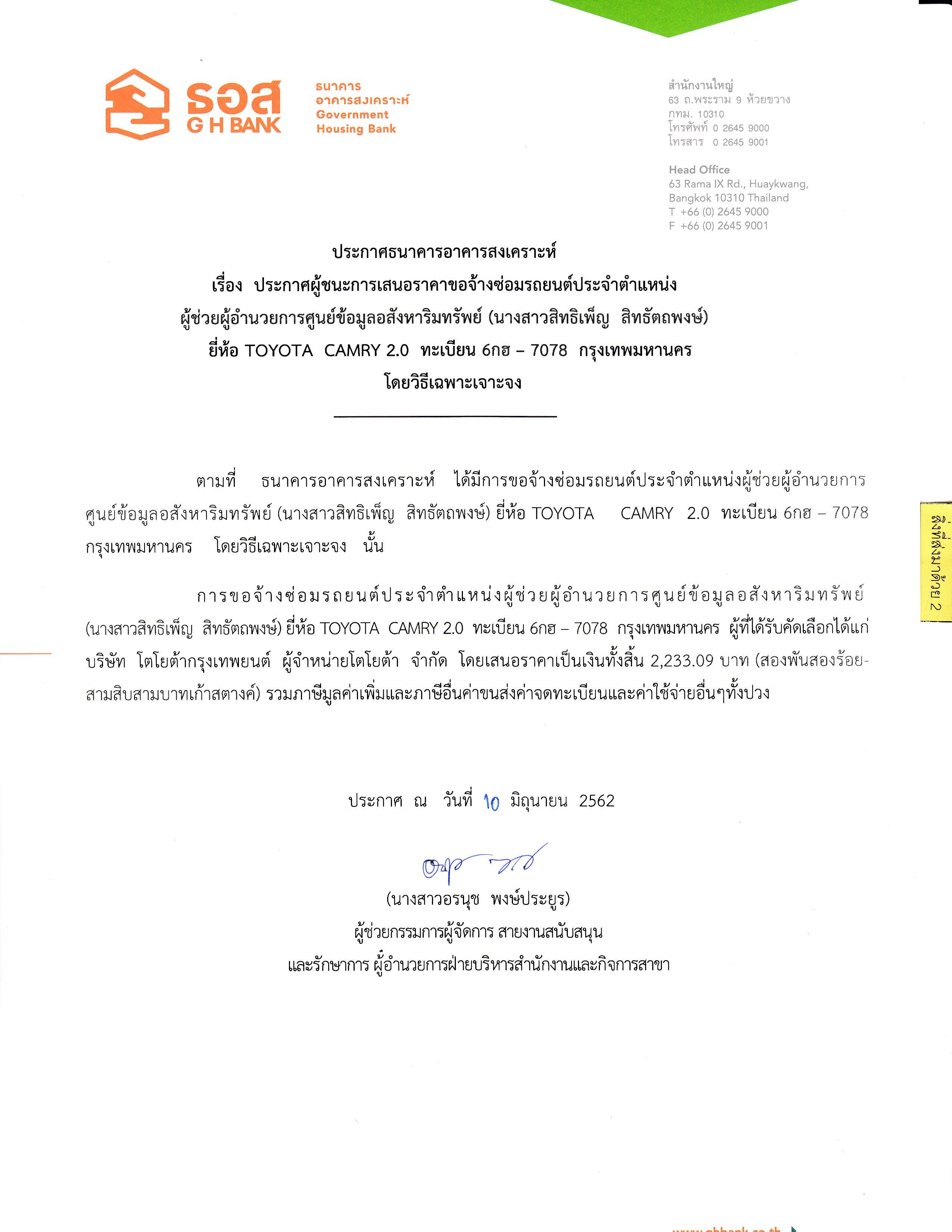 ประกาศผู้ชนะการประกวดราคาซ่อมรถยนต์ (คุณสิทธิเพ็ญ)
