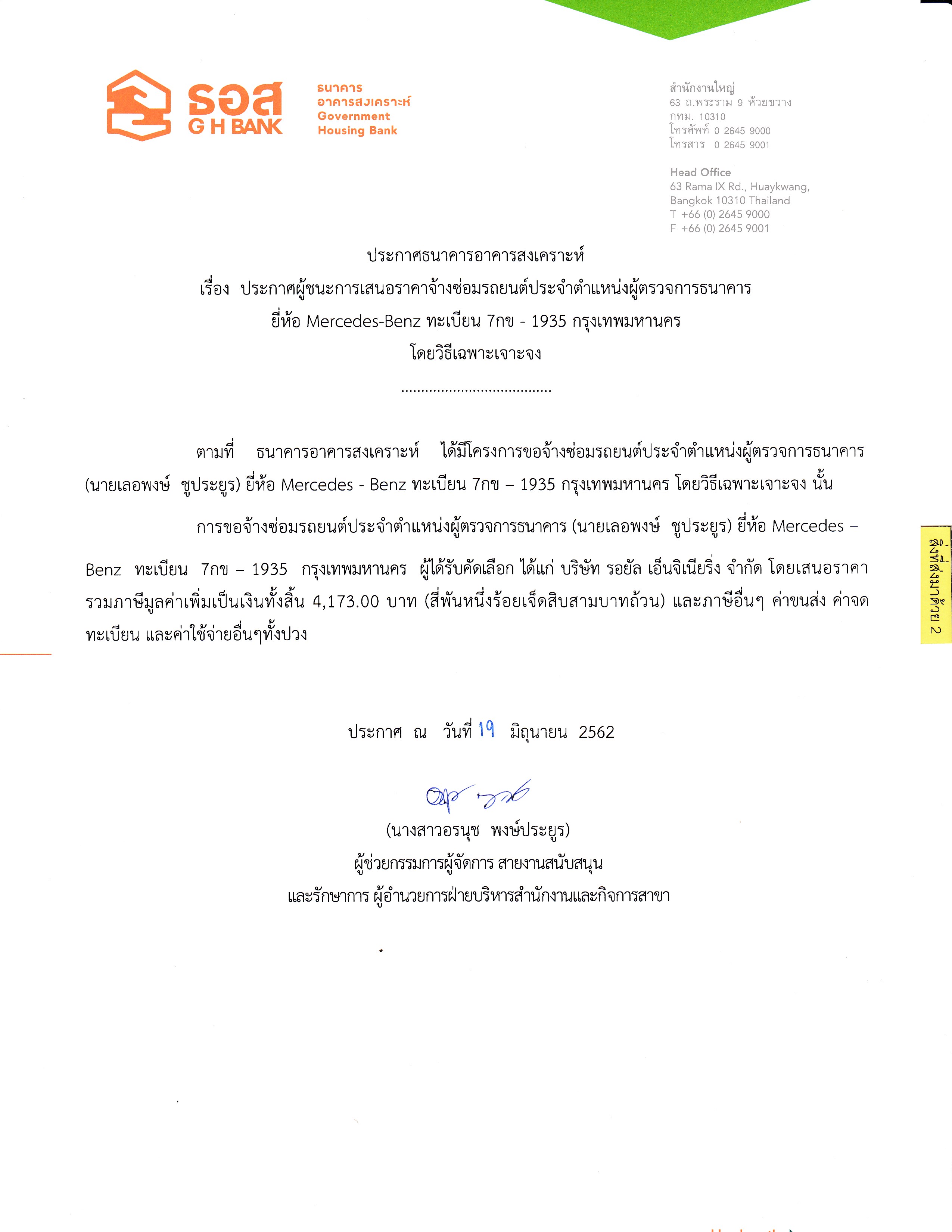 ประกาศผู้ชนะการประกวดราคาซ่อมรถยนต์ประจำตำแหน่ง (คุณเลอพงษ์ ชูประยูร)