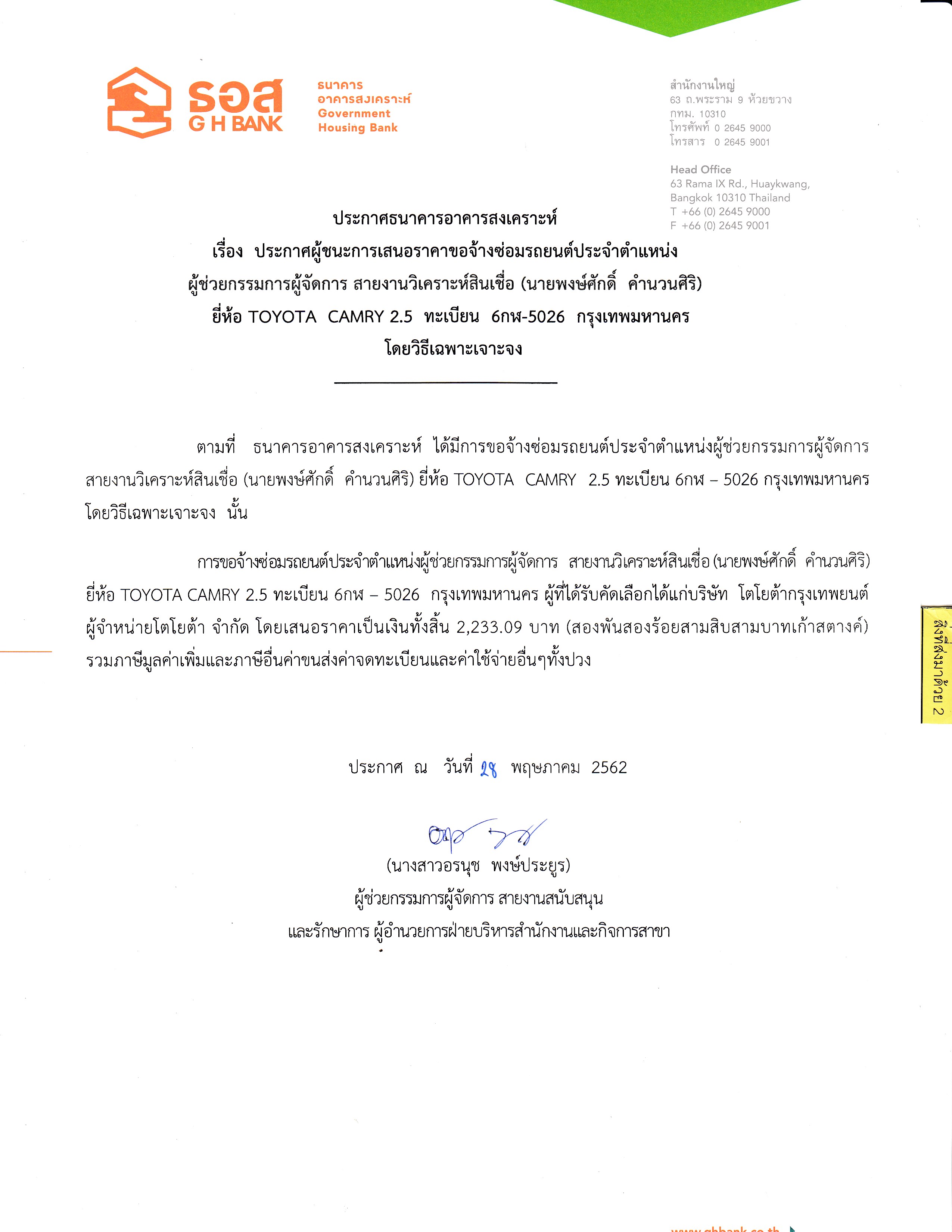 ประกาศผู้ชนะการเสนอราคาซ่อมรถยนต์ (คุณพงษ์ศักดิ์ คำนวนศิริ)