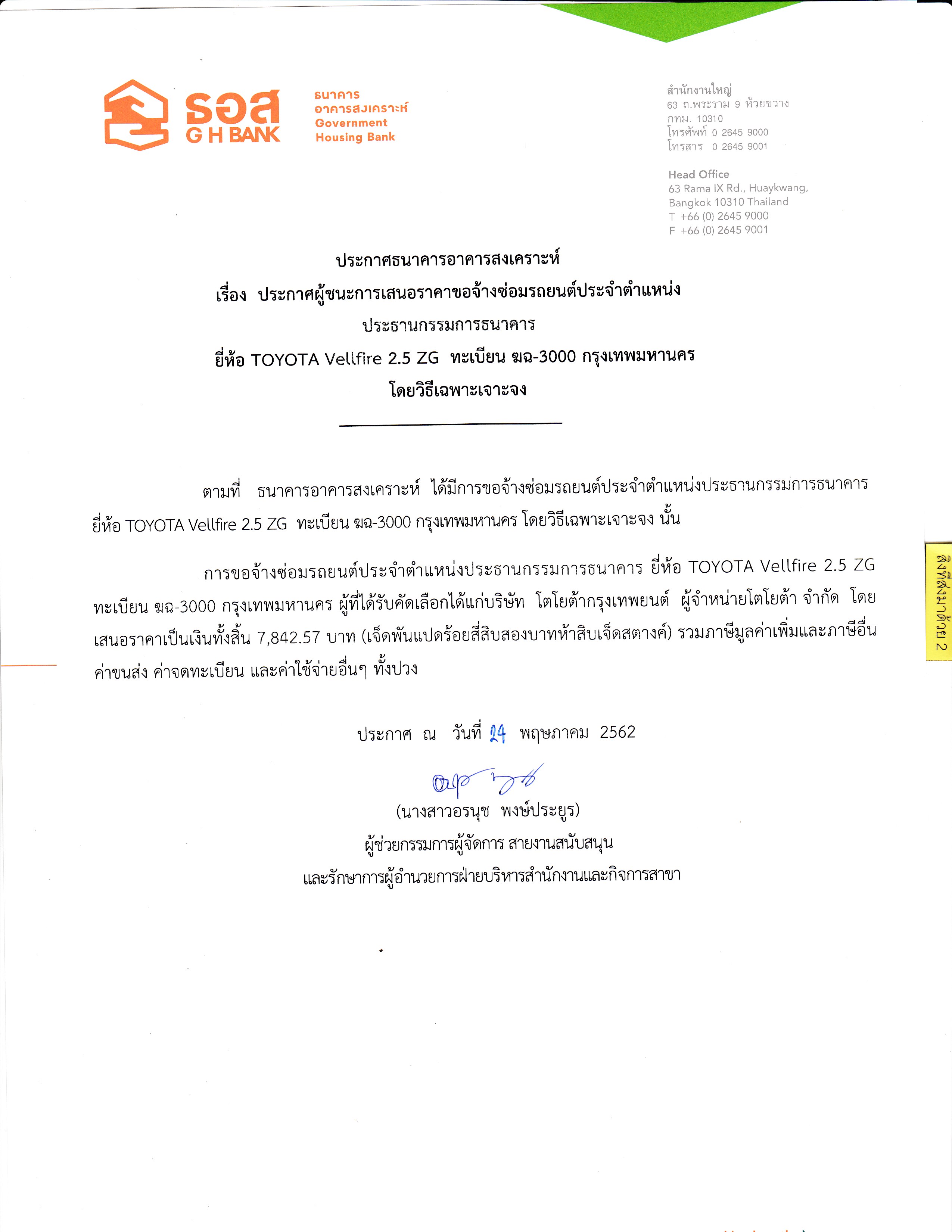 ประกาศผู้ชนะการเสนอราคาซ่อมรถยนต์ ทะเบียน ฆฉ 3000