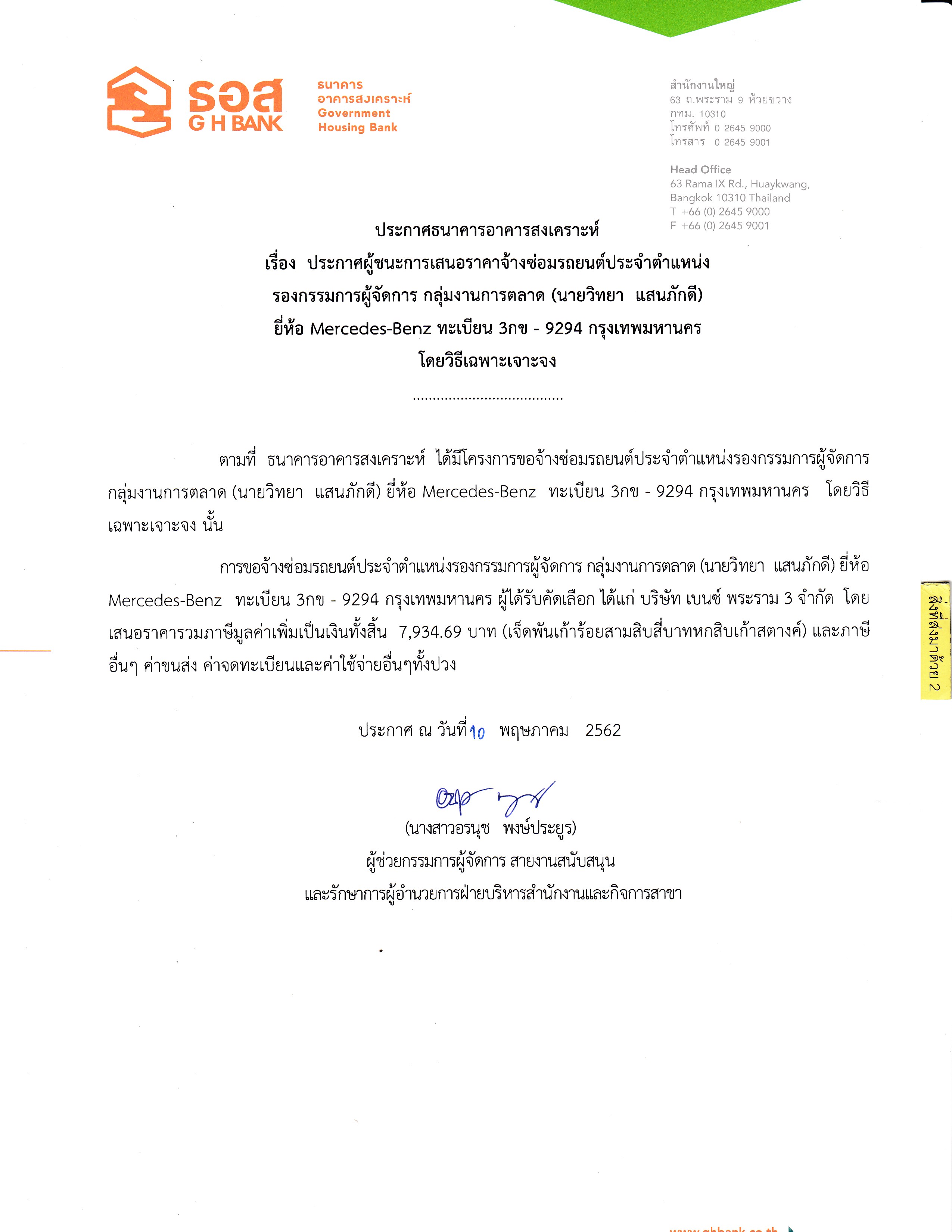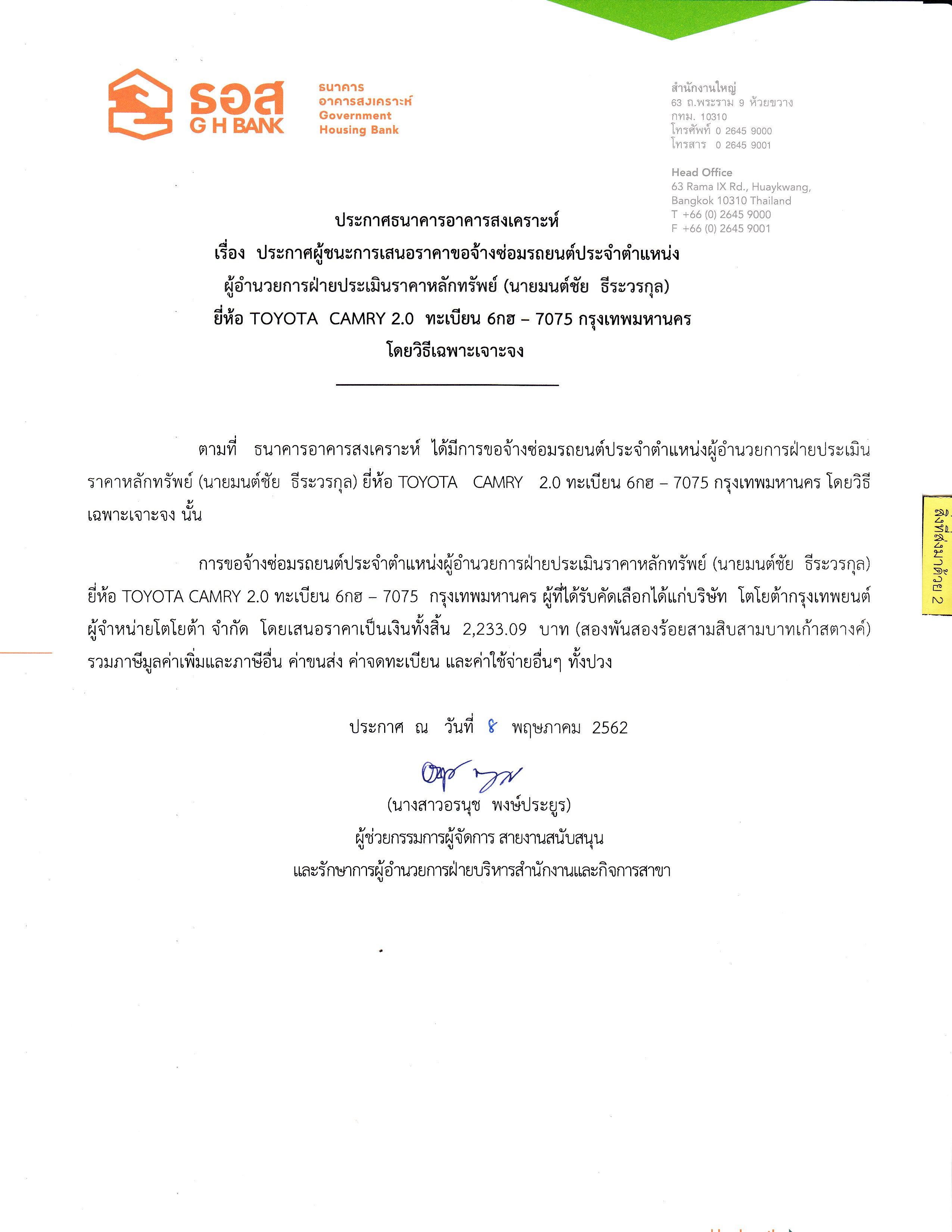 ประกาศผู้ชนะการเสนอราครซ่อมรถยนต์ (คุณมนต์ชัย ธีระวรกุล)
