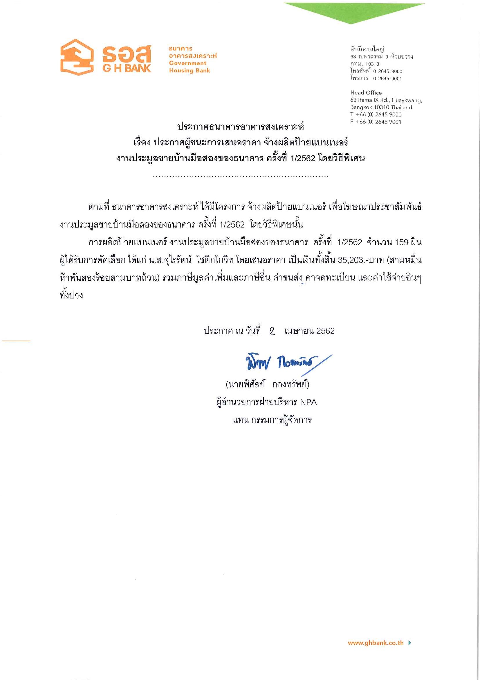 ประกาศผู้ชนะการเสนอราคา จ้างผลิตป้ายแบนเนอร์ งานประมูลขายบ้านมือสองของธนาคาร ครั้งที่ 1/2562 โดยวิธีพิเศษ