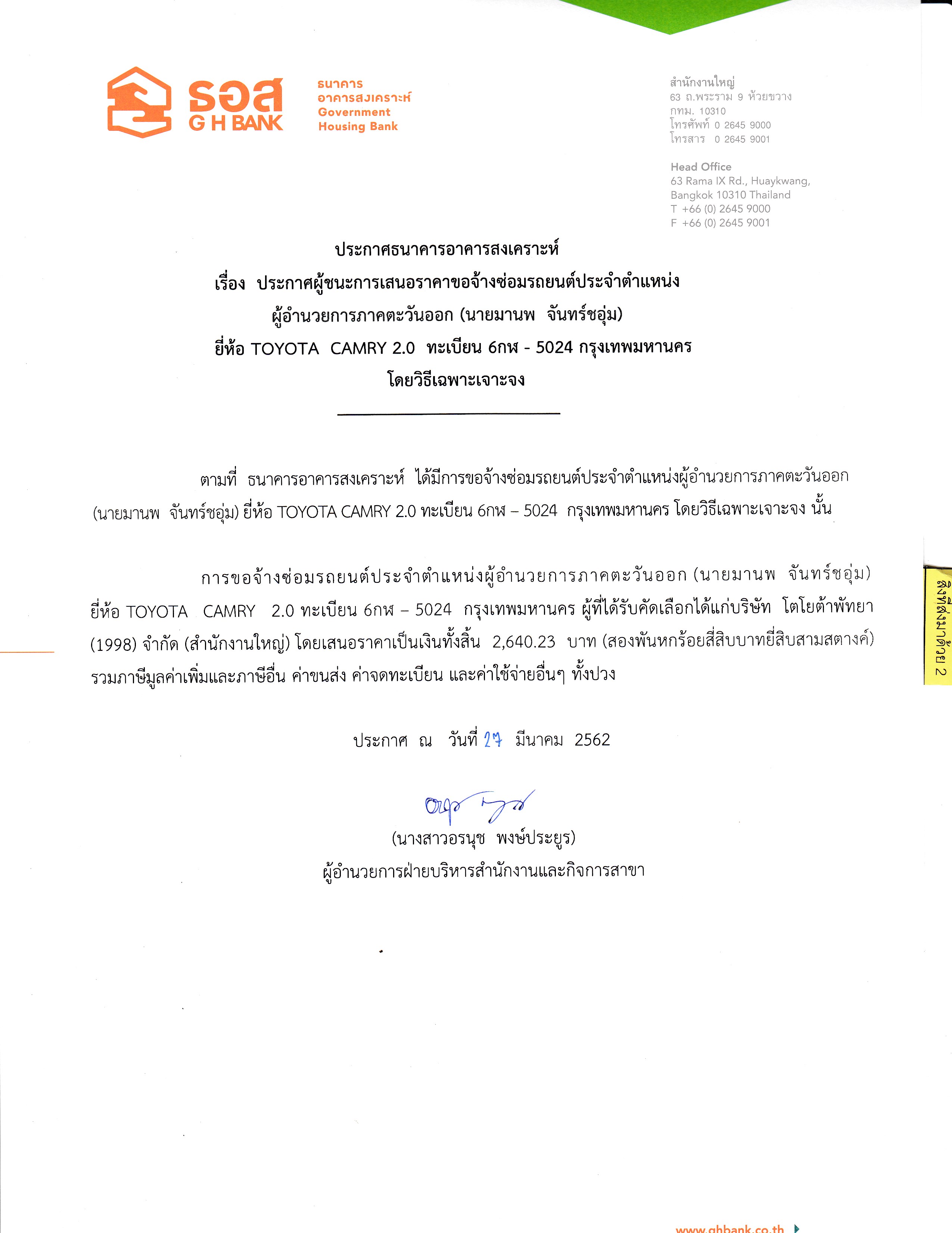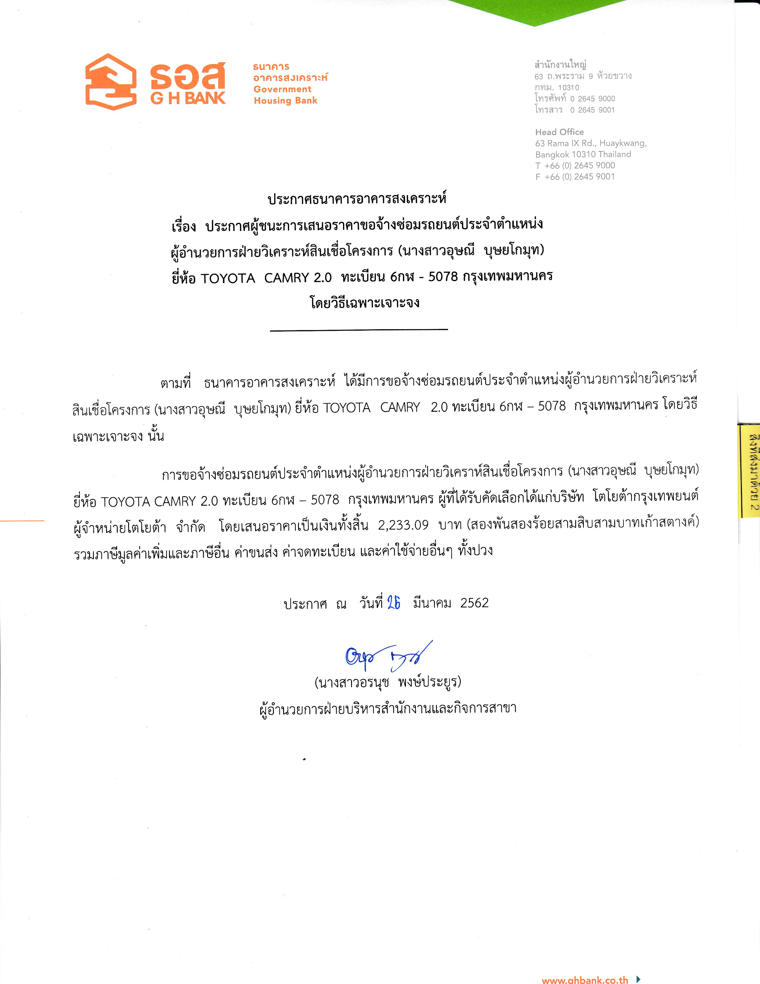 ประกาศผู้ชนะการเสนอราคาซ่อมรถยนต์ ผู้อำนวยการฝ่ายวิเคราะห์สินเชื่อโครงการ