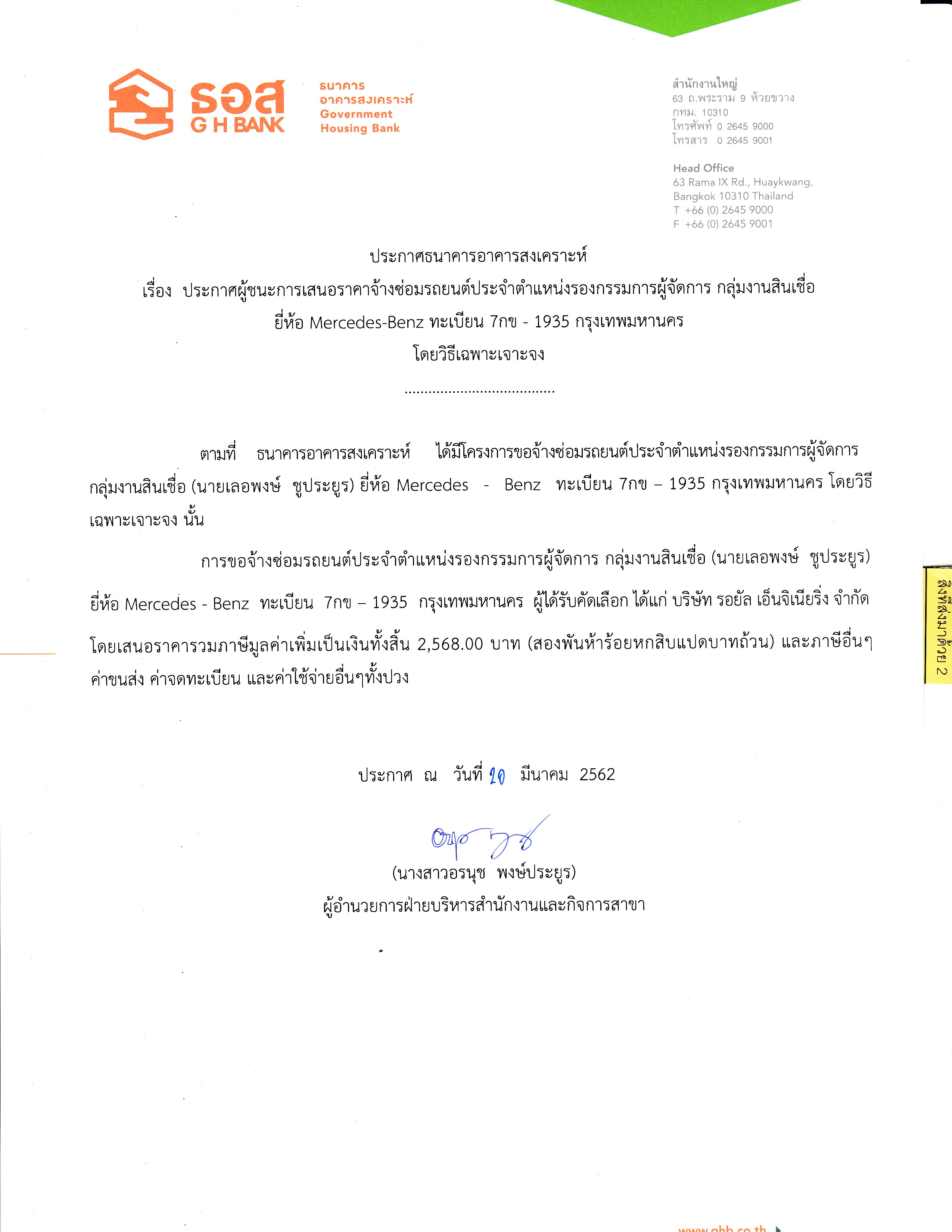 ประกาศผู้ชนะการเสนอราคาขอจ้างซ่อมรถยนต์ประจำตำแหน่ง รองกรรมการผู้จัดการ ยี่ห้อ Mercedes-Benz ทะเบียน 7กข 1935 กรุงเทพมหานคร โดยวิธีเฉพาะเจาะจง