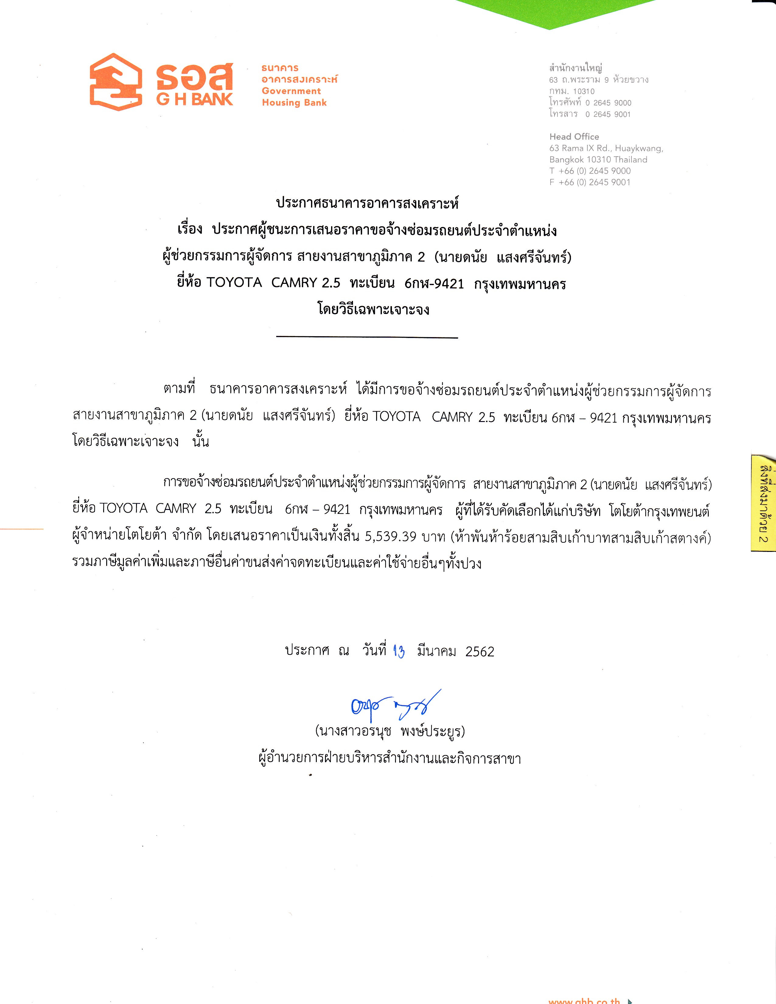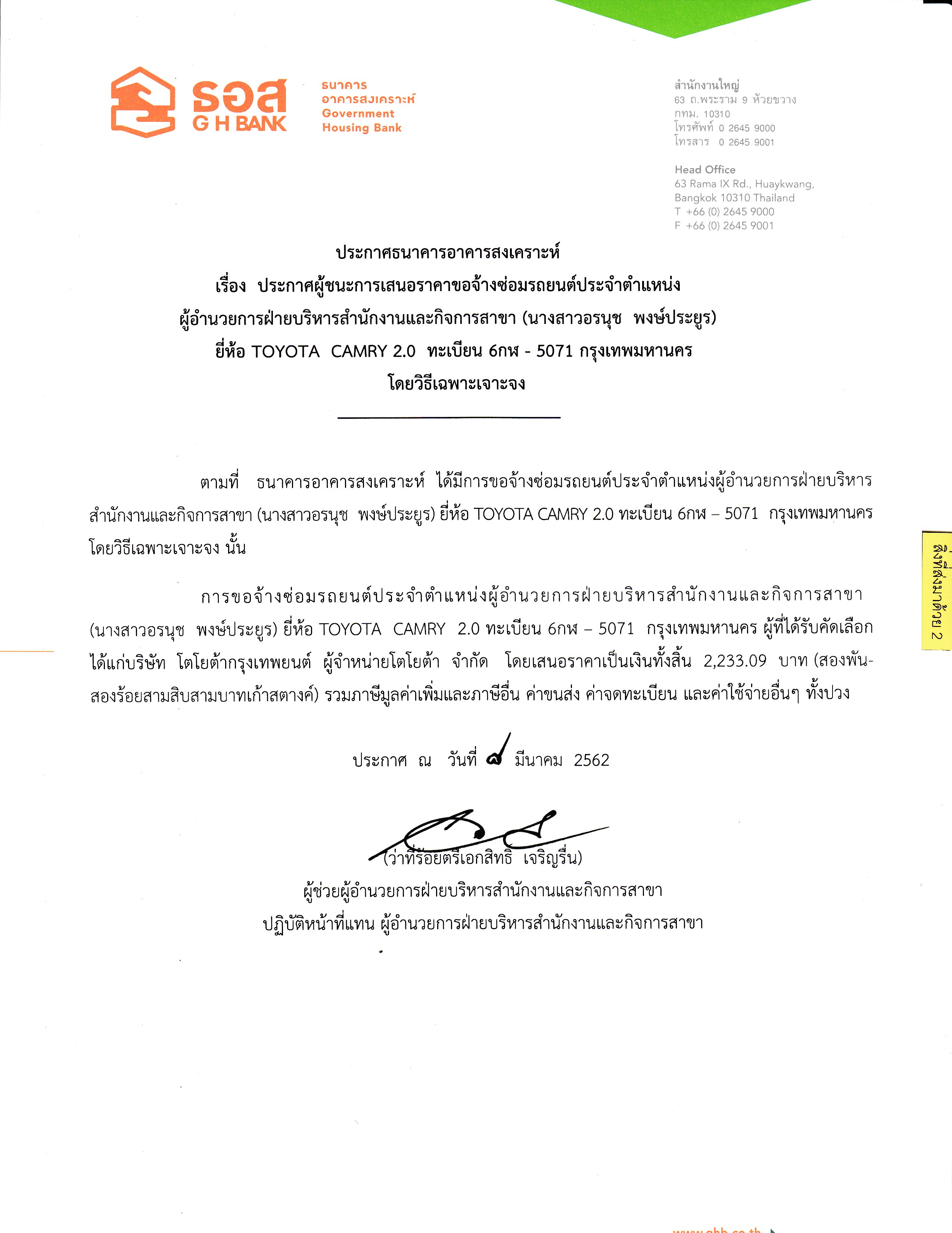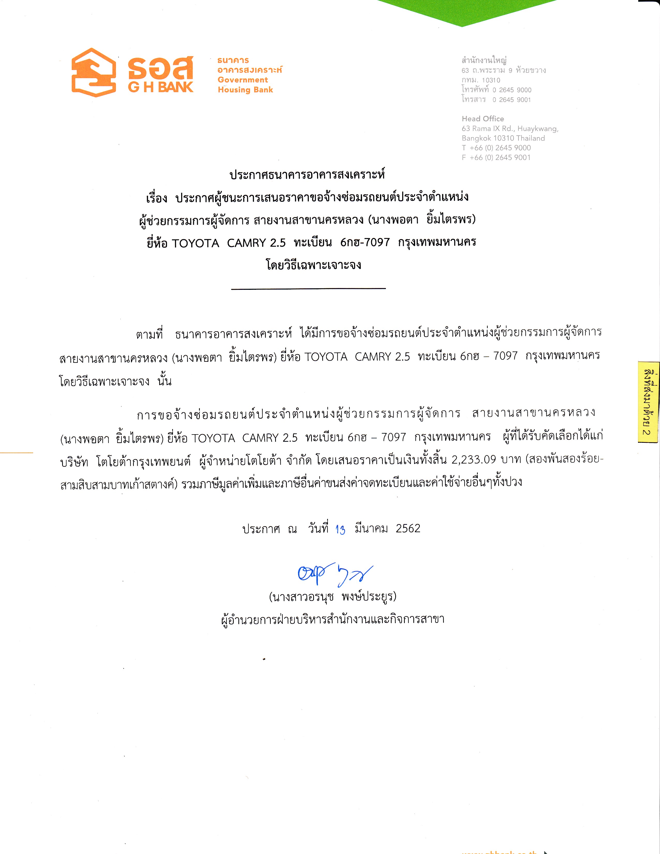 ประกาศผู้ชนะการเสนอราคาขอจ้างซ่อมรถยนต์ประจำตำแหน่ง ผู้อำนวยการฝ่ายบริหารสำนักงานและกิจการสาขา (คุณอรนุช พงษ์ประยูร) ยี่ห้อ TOYOTA CAMRY 2.0 ทะเบียน 6กฬ-5071 กรุงเทพมหานคร โดยวิธีเฉพาะเจาะจง