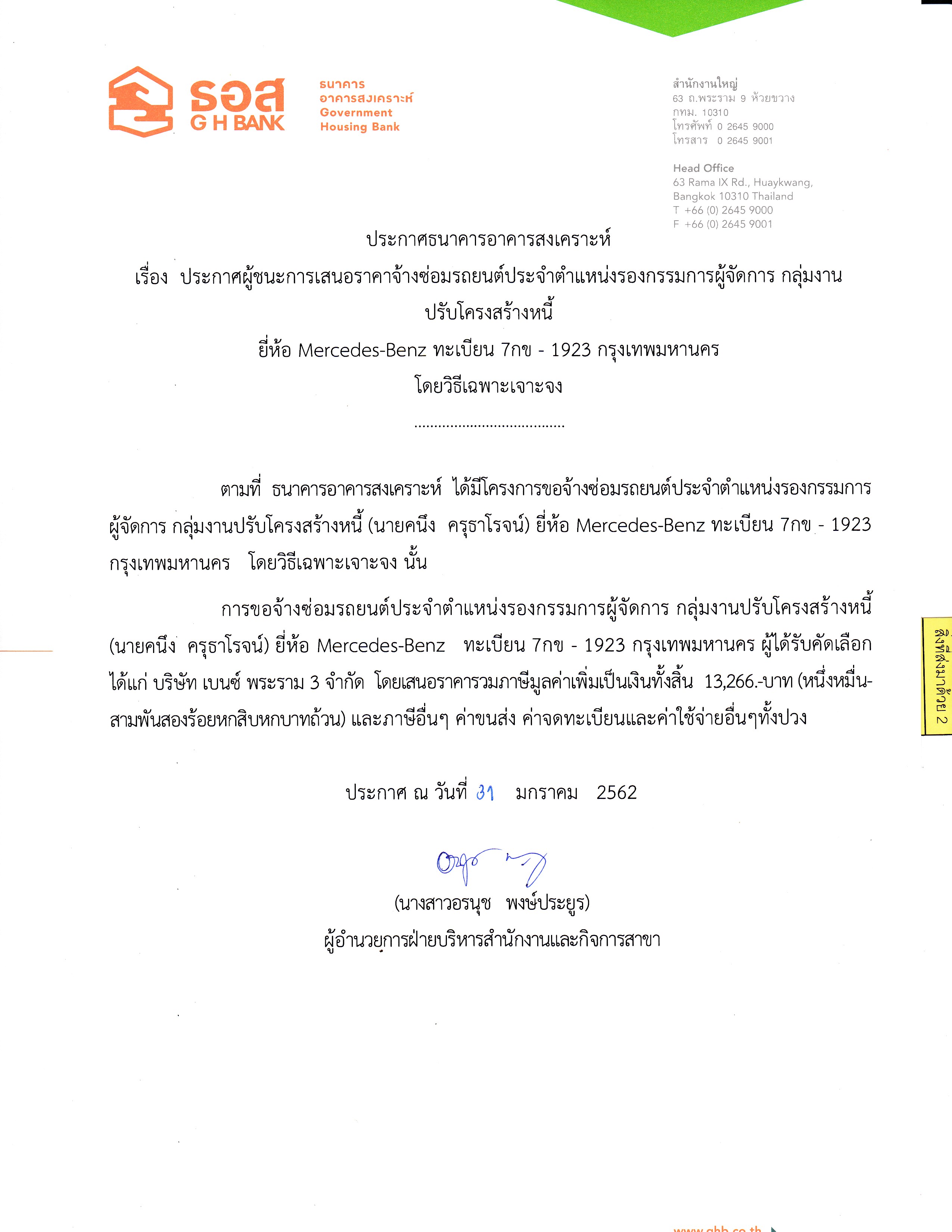 ประกาศผู้ชนะการเสนอราคาจ้างบริษัทฯดำเนินการจัดทำ Vimarn by GH Bank ประจำปี 2562 โดยวิธีพิเศษ