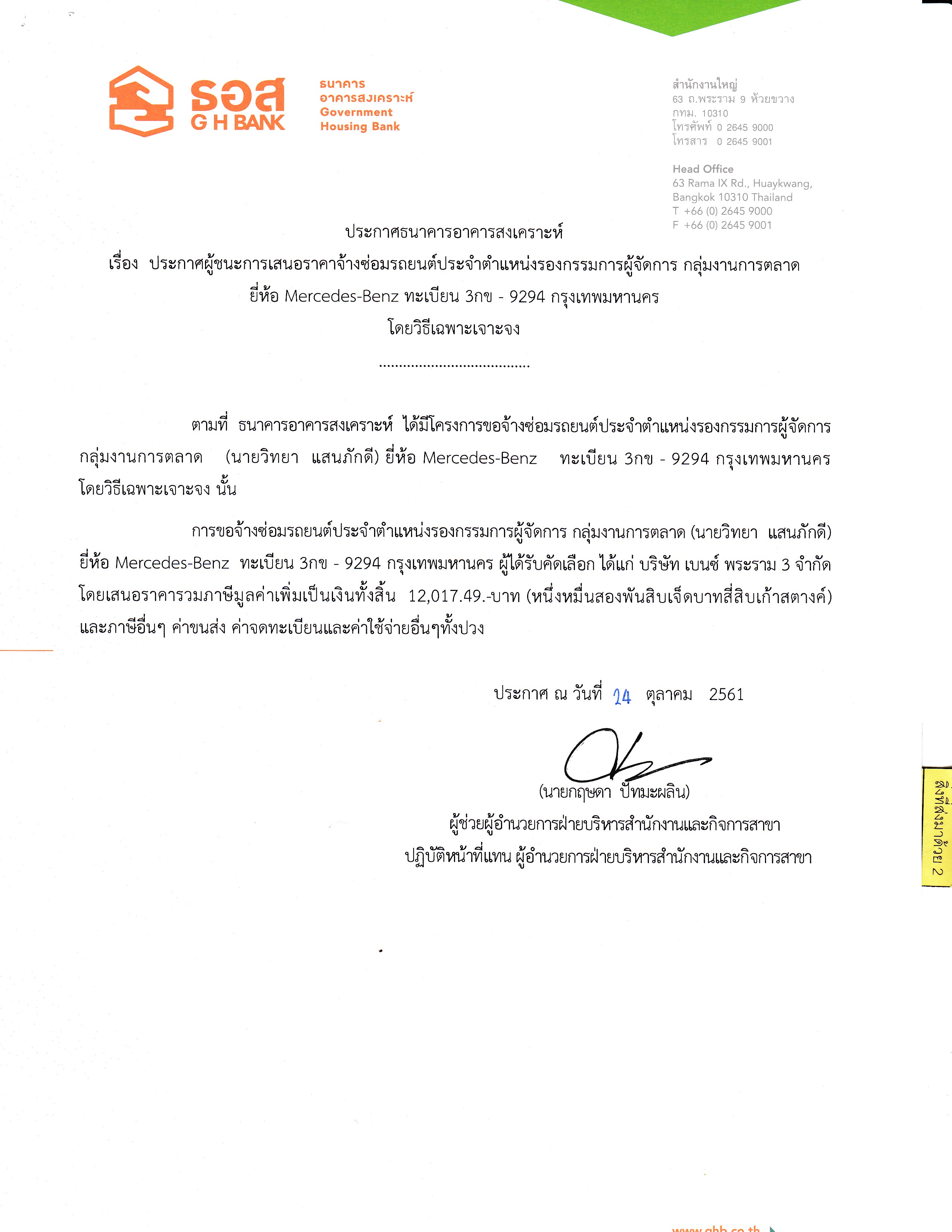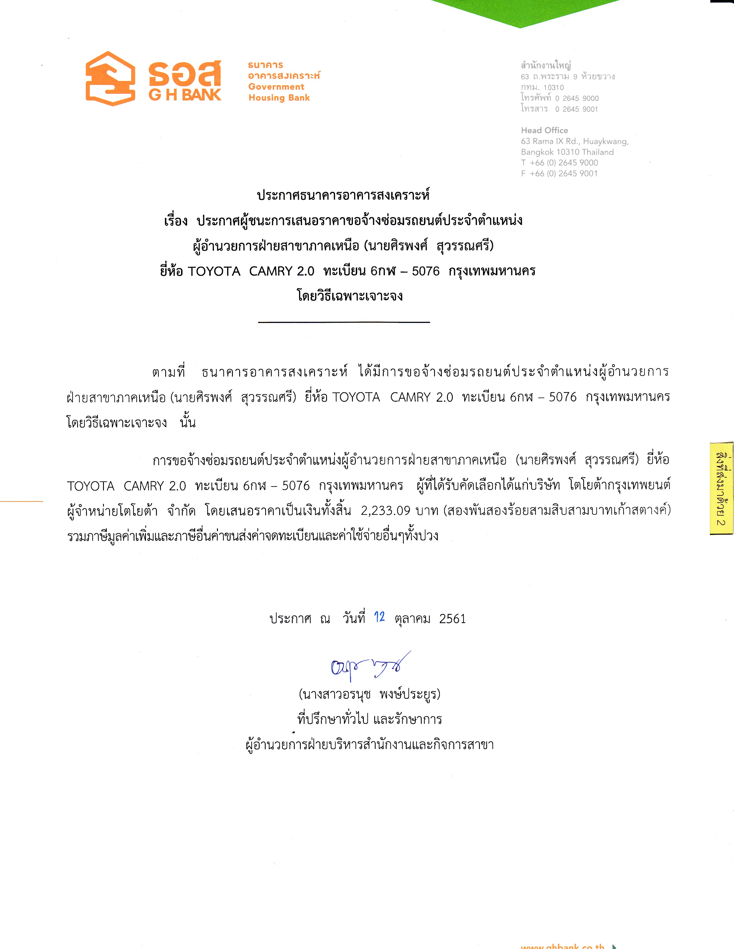 ธอส.ประกาศผู้ชนะการเสนอราคาซ่อมรถยนต์ประจำตำแหน่งผู้อำนวยการฝ่ายสาขาภาคเหนือ(คุณศิรพงศ์ สุวรรณศรี)