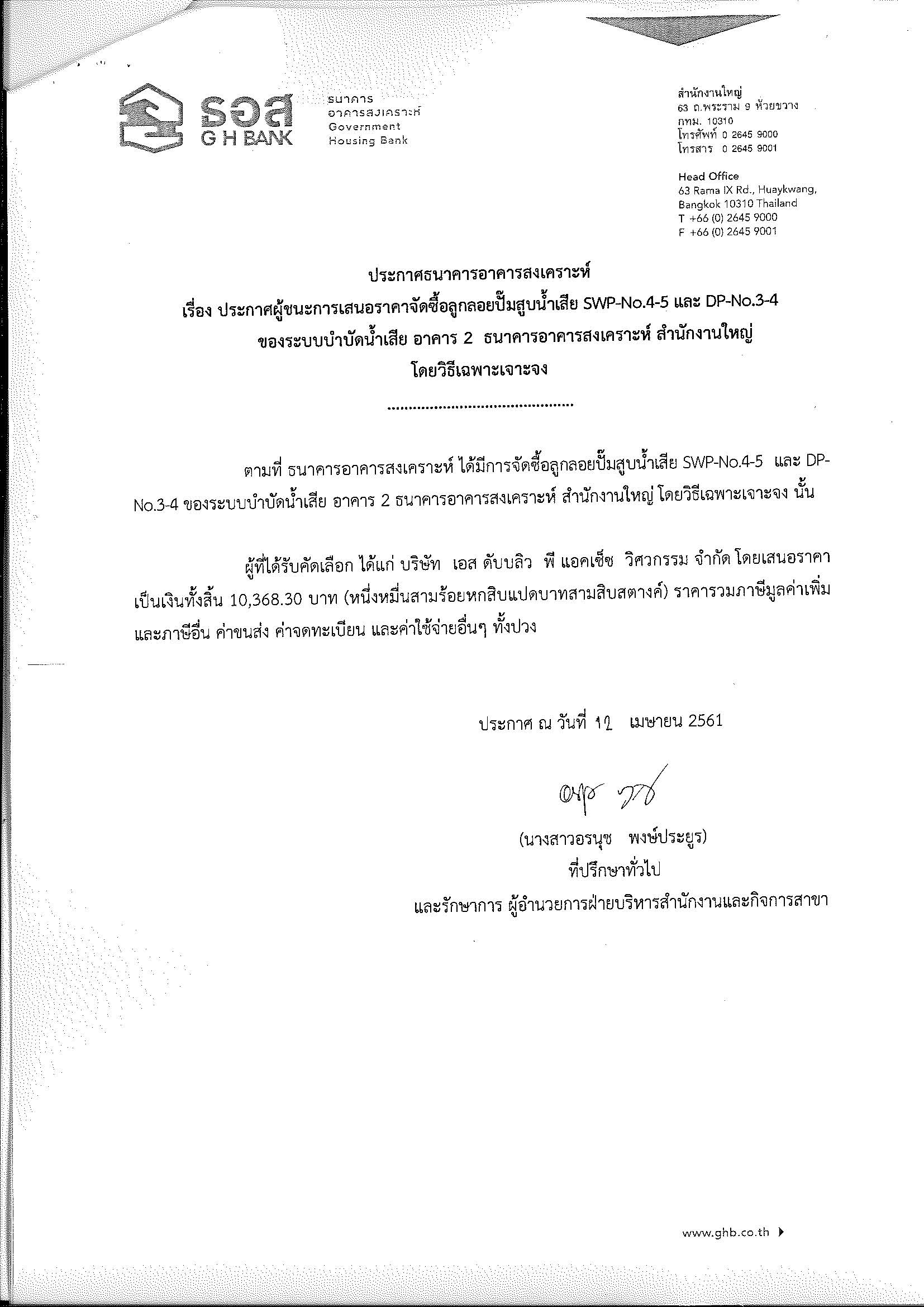 ธอส. ประกาศผู้ชนะการเสนอราคาสั่งซื้อลูกลอยปั๊มสูบน้ำเสีย SWP-No.4-5 และ DP-No.3-4 ของระบบบำบัดน้ำเสีย ธนาคารฯ